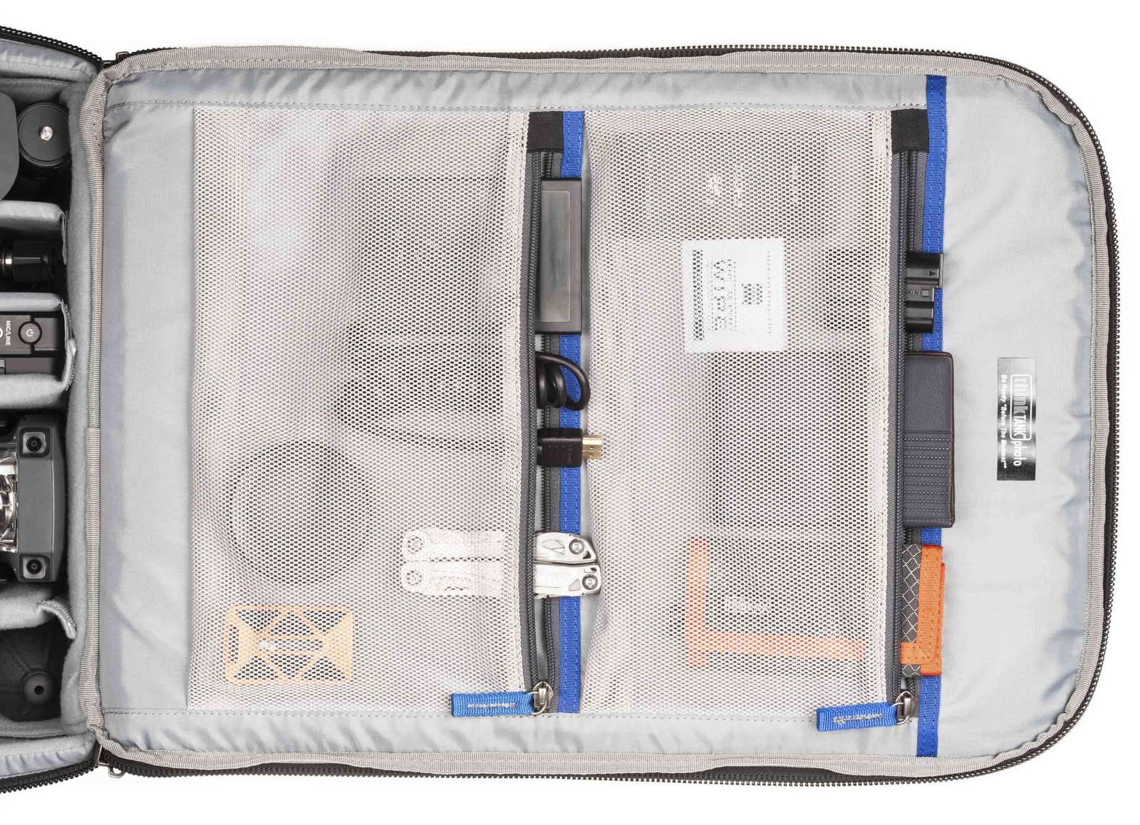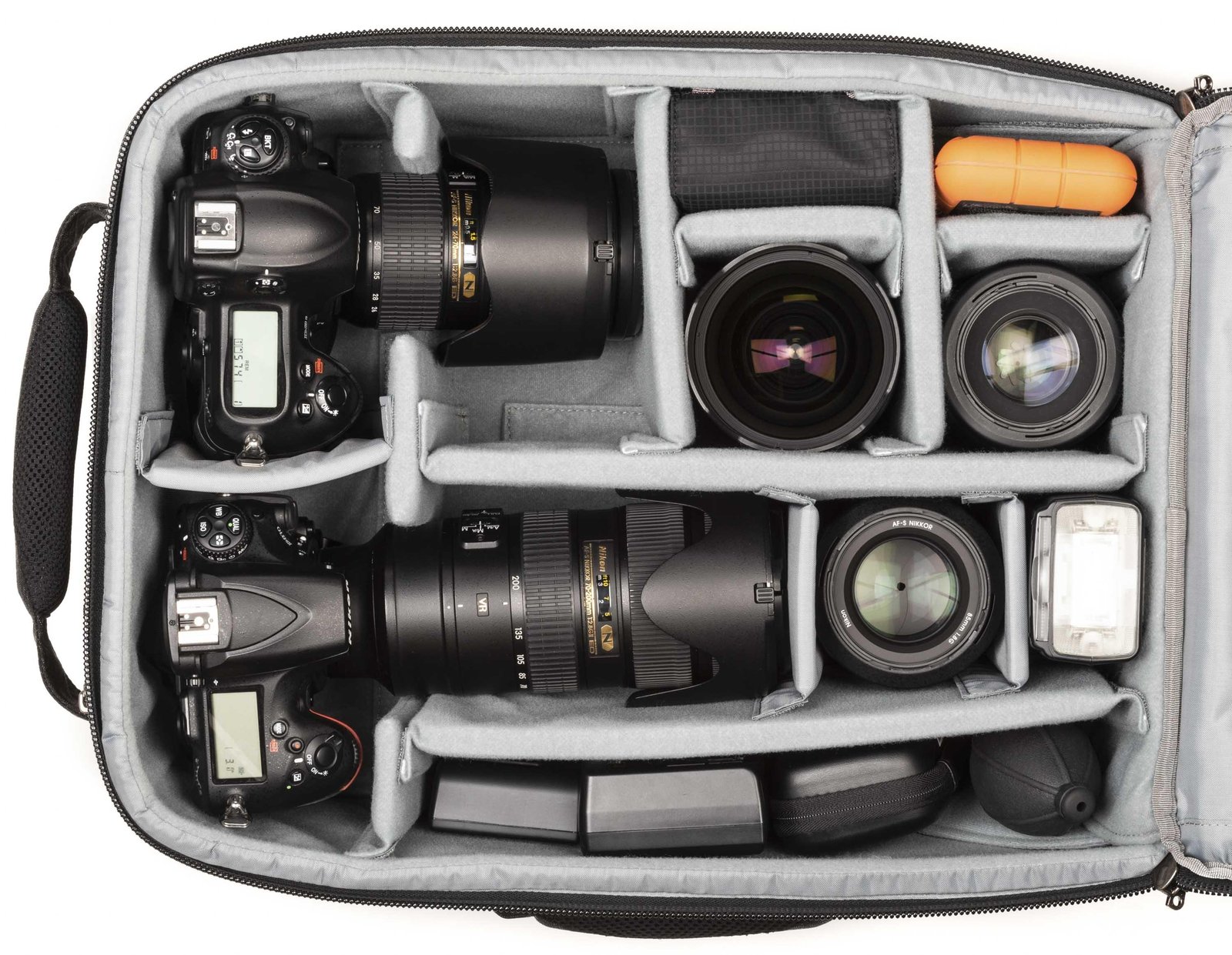 Interior zippered pockets for batteries, CF cards, filters and accessories