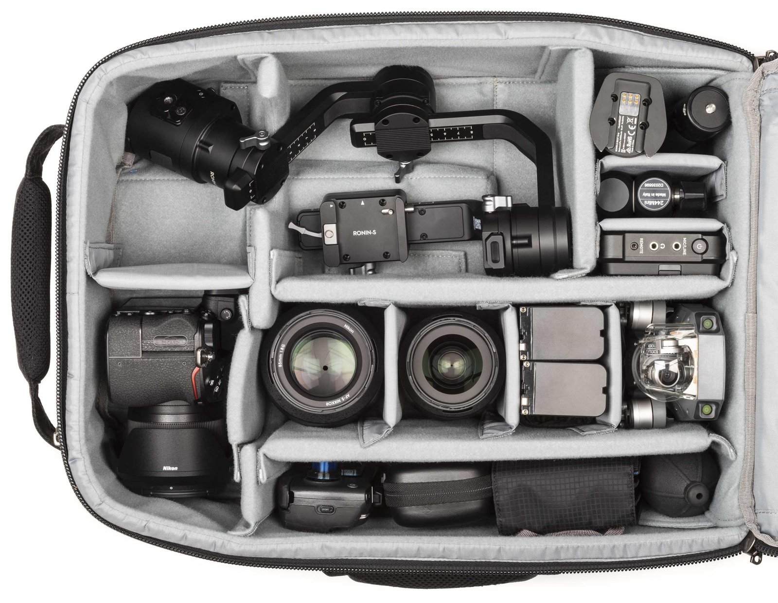 Mirrorless video kit with lenses, batteries, DJI Ronin-S and DJI Mavic Pro