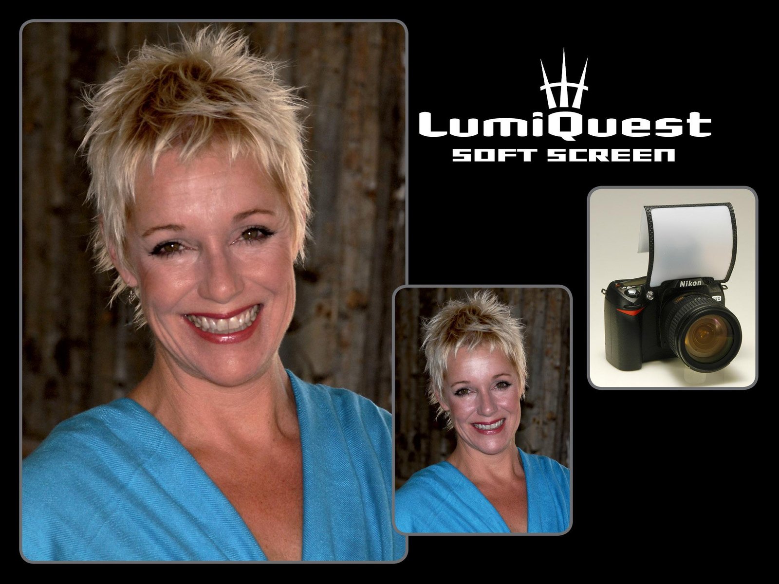 Large photo of model shows results using the LumiQuest Soft Screen while the small photo of model shows comparison with direct flash.