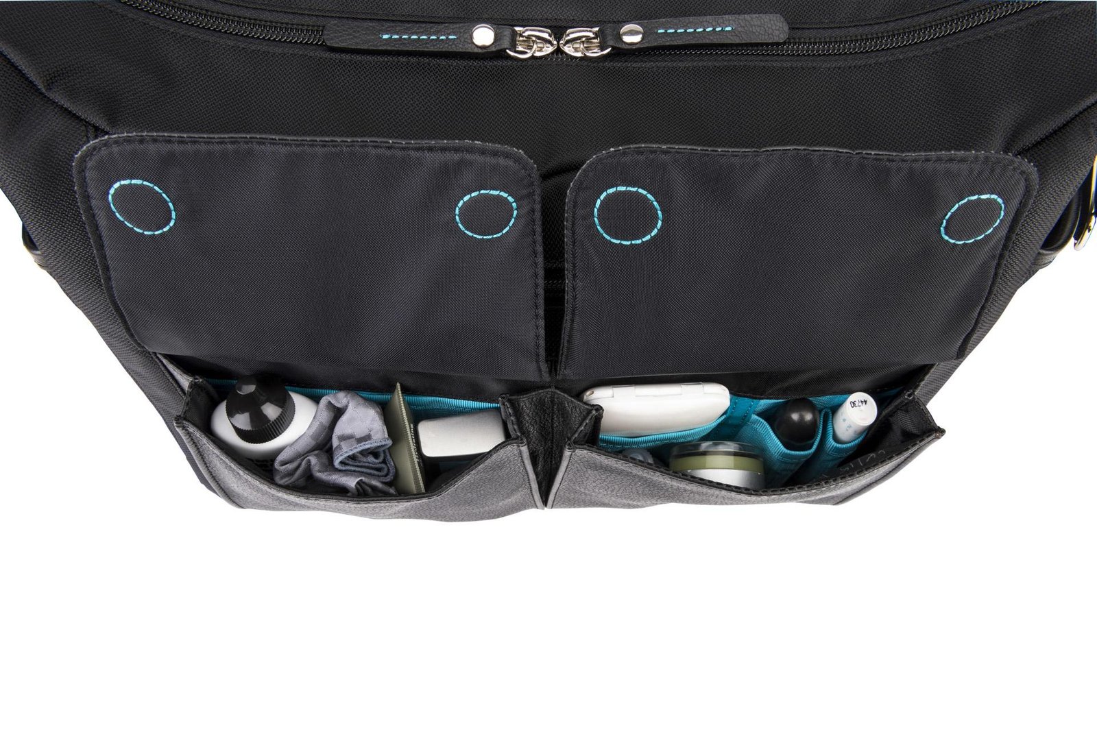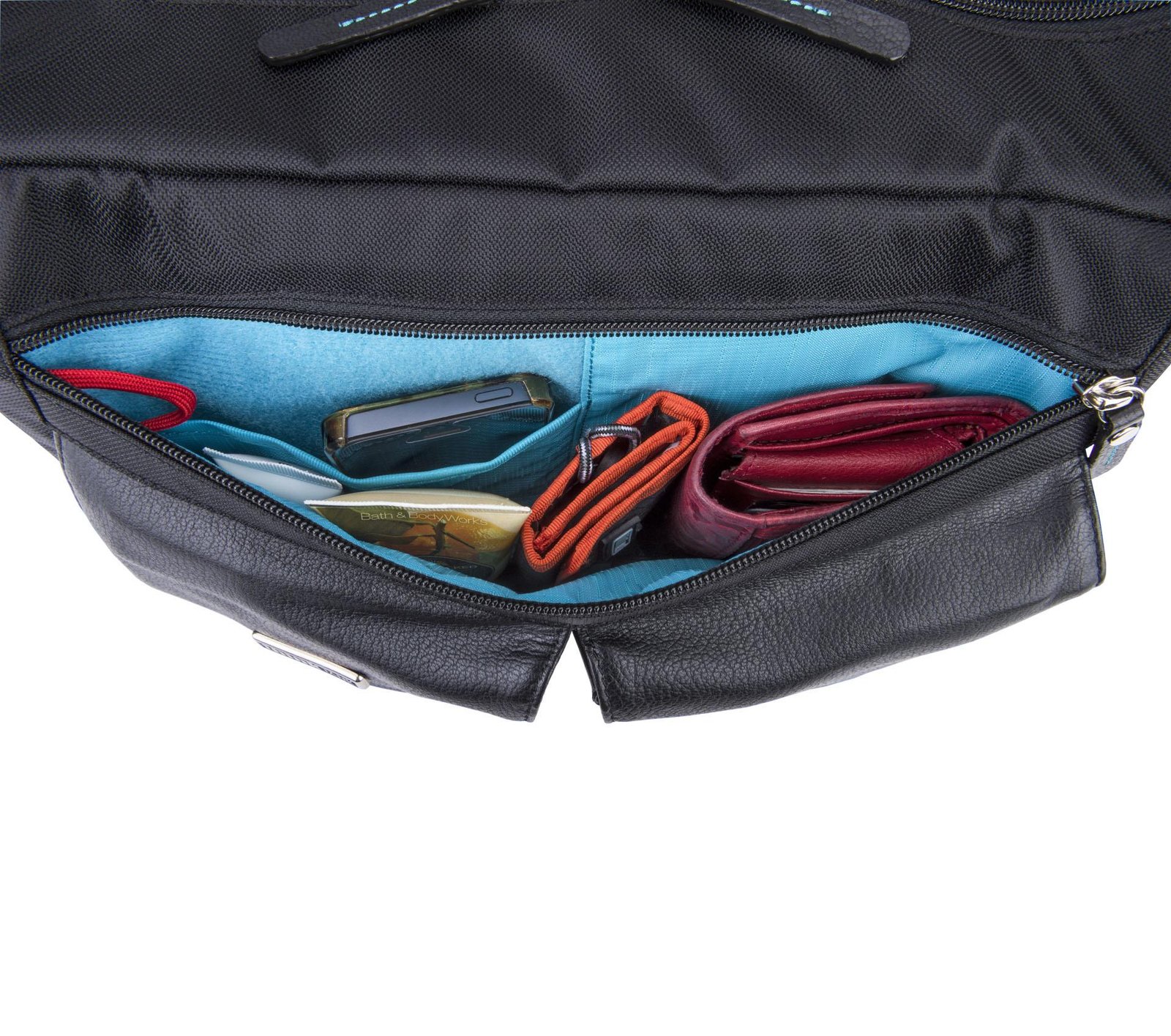 • Built-in organizer for pens and business cards plus a dedicated phone pocket