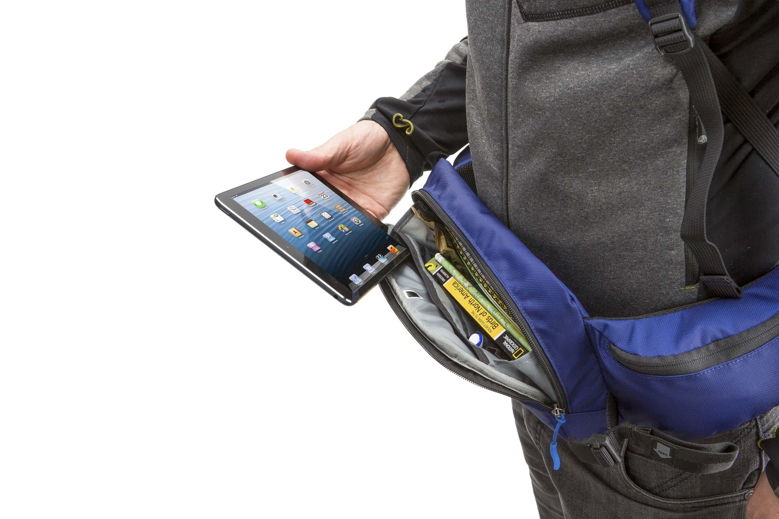 Beltpack: 8” tablet (iPad mini), large point & shoot camera, small electronics, guide books, maps, passport, tickets, currency, ID, food & more