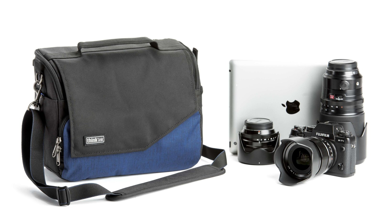Example: Fuji X-T1 w/ 18-55mm f/2.8-4 attached (hood reversed) + 14mm f/2.8 (hood in position) + 60mm f/2.8 (hood in position), plus an iPad mini