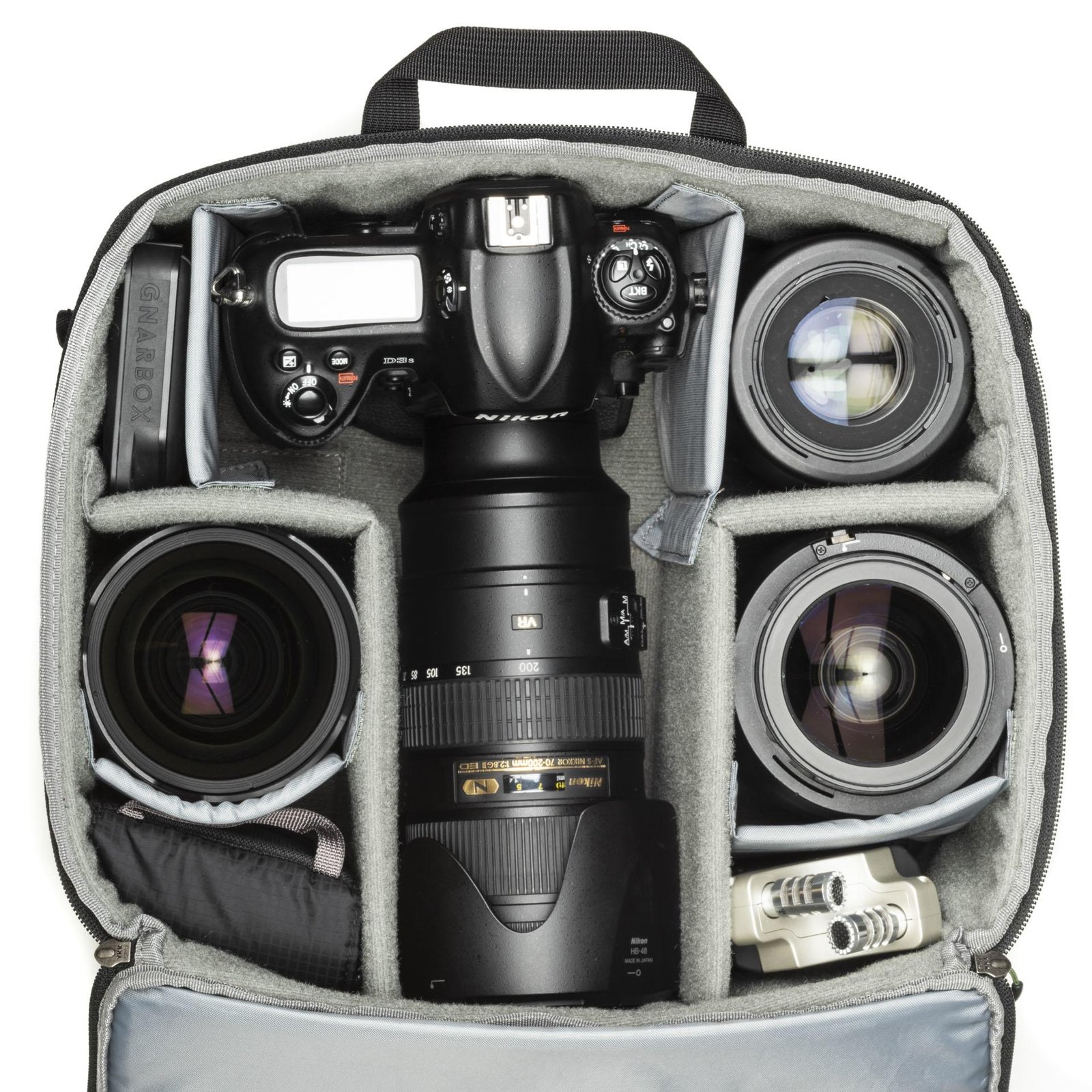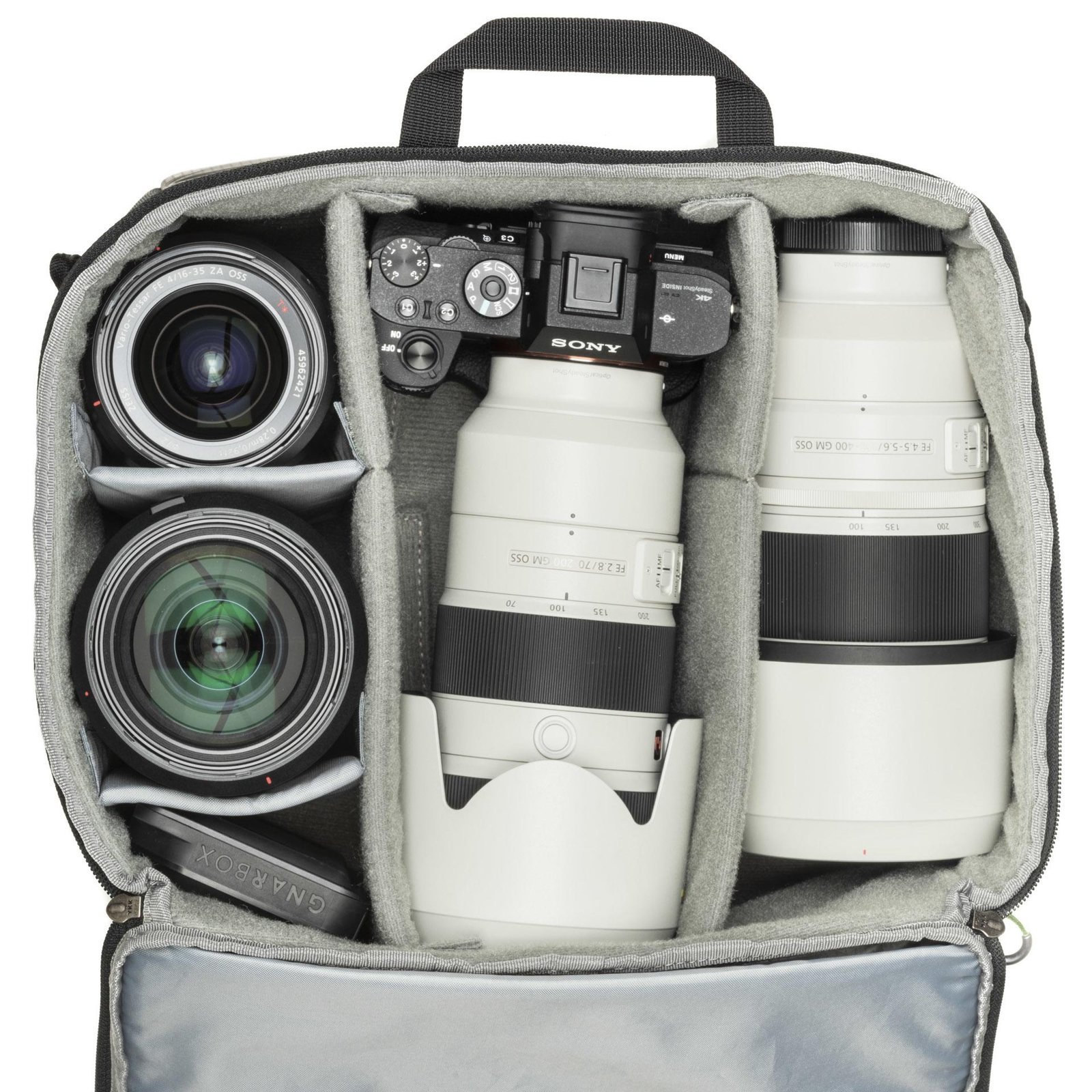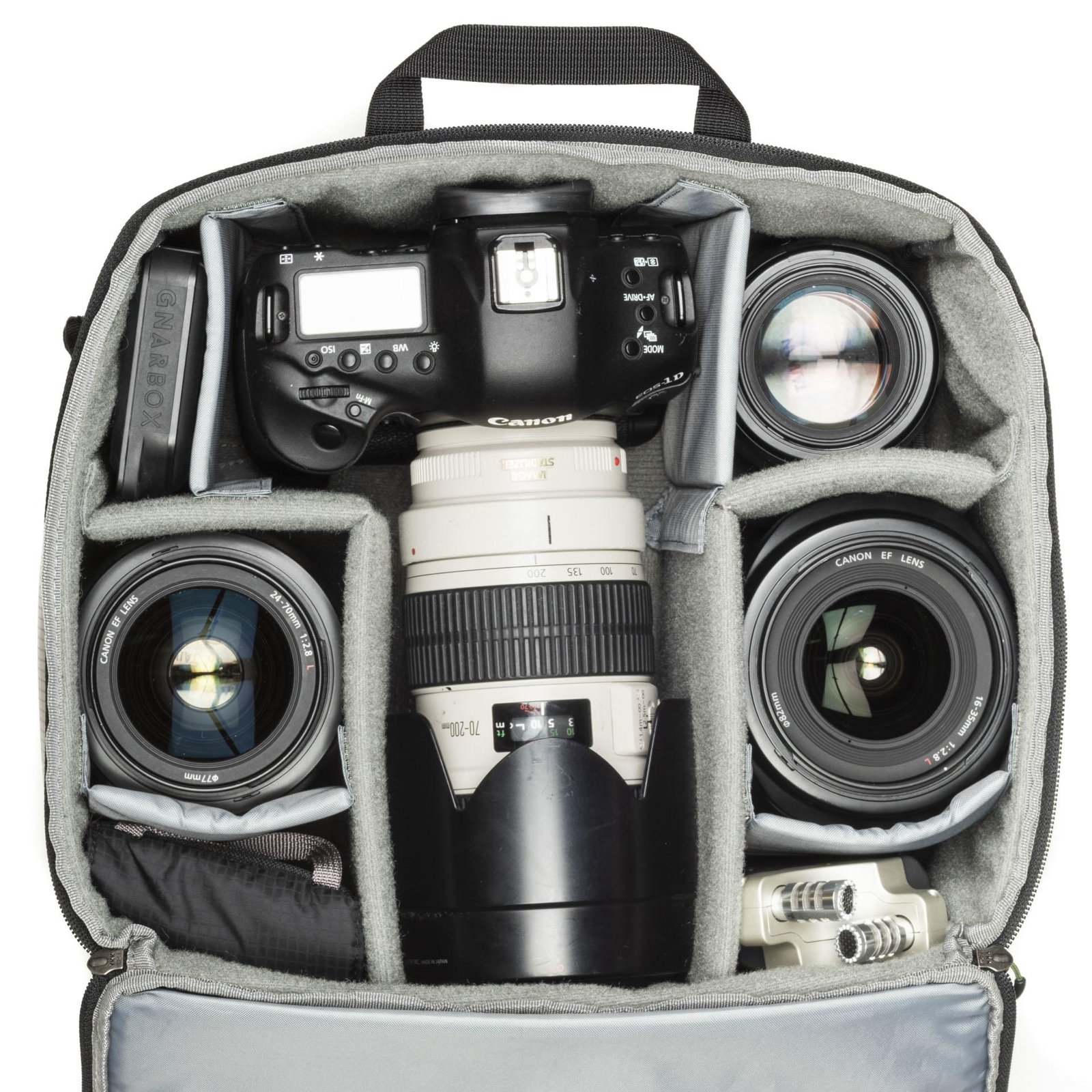 - Sized to fit pro gear including a gripped body attached to a 70–200mm f2.8