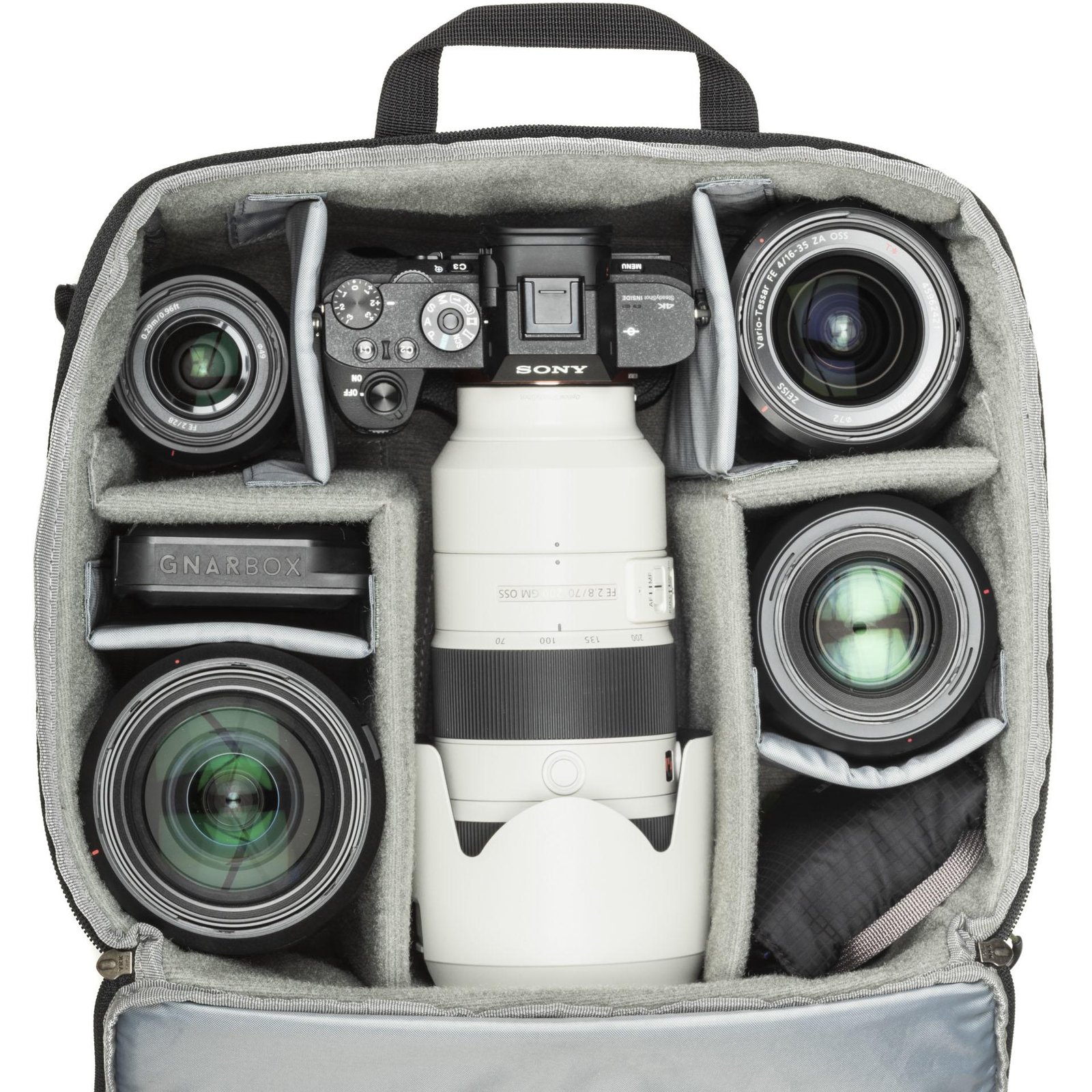 - Holds two gripped mirrorless bodies with lenses attached up to a 70–200mm f2.8 + 3–5 additional lenses