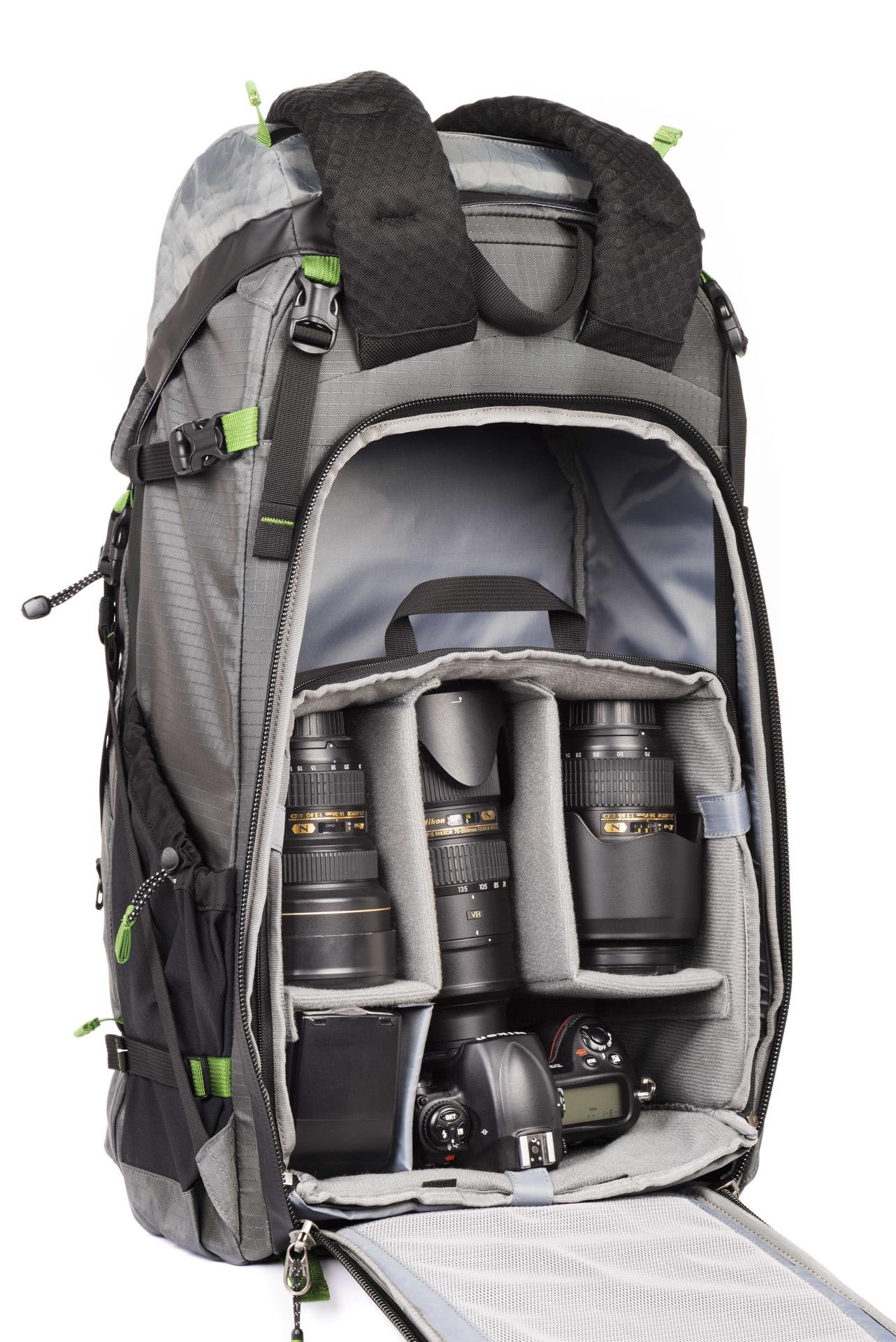 - Holds one gripped DSLR with lenses attached up to a 70–200mm f2.8 + 2–3 standard zoom lenses + flash